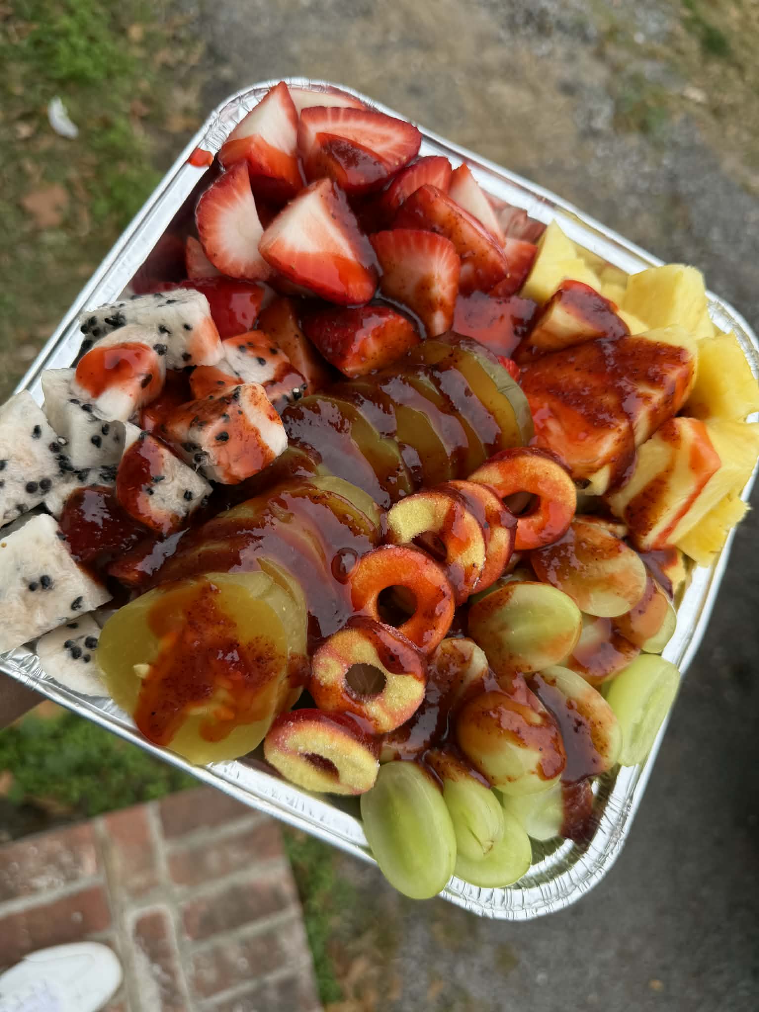 Our Fruit Tray is a vibrant and flavorful snack featuring 4 fresh fruits, paired with a tangy pickle and chewy peach rings. Perfectly balanced for sweet, tangy, and fun snacking!