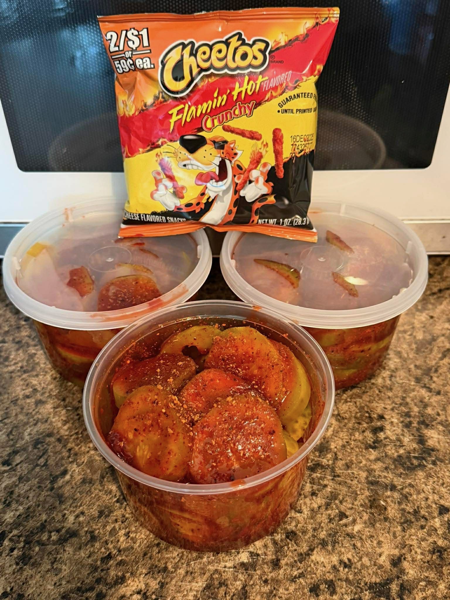 Our Pickle Bows are a crunchy, tangy snack topped with chamoy, tajín, and a peach rings, paired with a bag of Flamin’ Hot Cheetos for the perfect sweet, spicy, and zesty combo. A bold and irresistible treat that’s bursting with flavor!